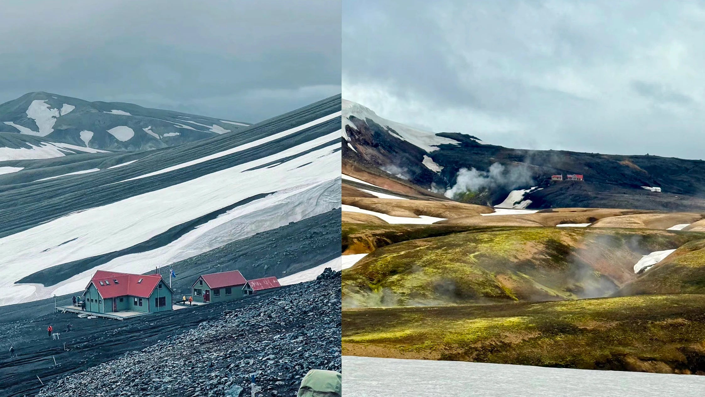 Quitter le refuge, c’est comme tourner une page. Fini le blanc total, place à un décor tellement inattendu que tu te demandes si ce n’est pas un film. La neige recule doucement et laisse apparaître les premières langues de mousse vert fluo. Un vert violent, presque irréel, qui tranche avec le noir profond des coulées de lave. Le contraste est saisissant : un monde de roche brute, humide, vivante, où la couleur semble chargée d’énergie.