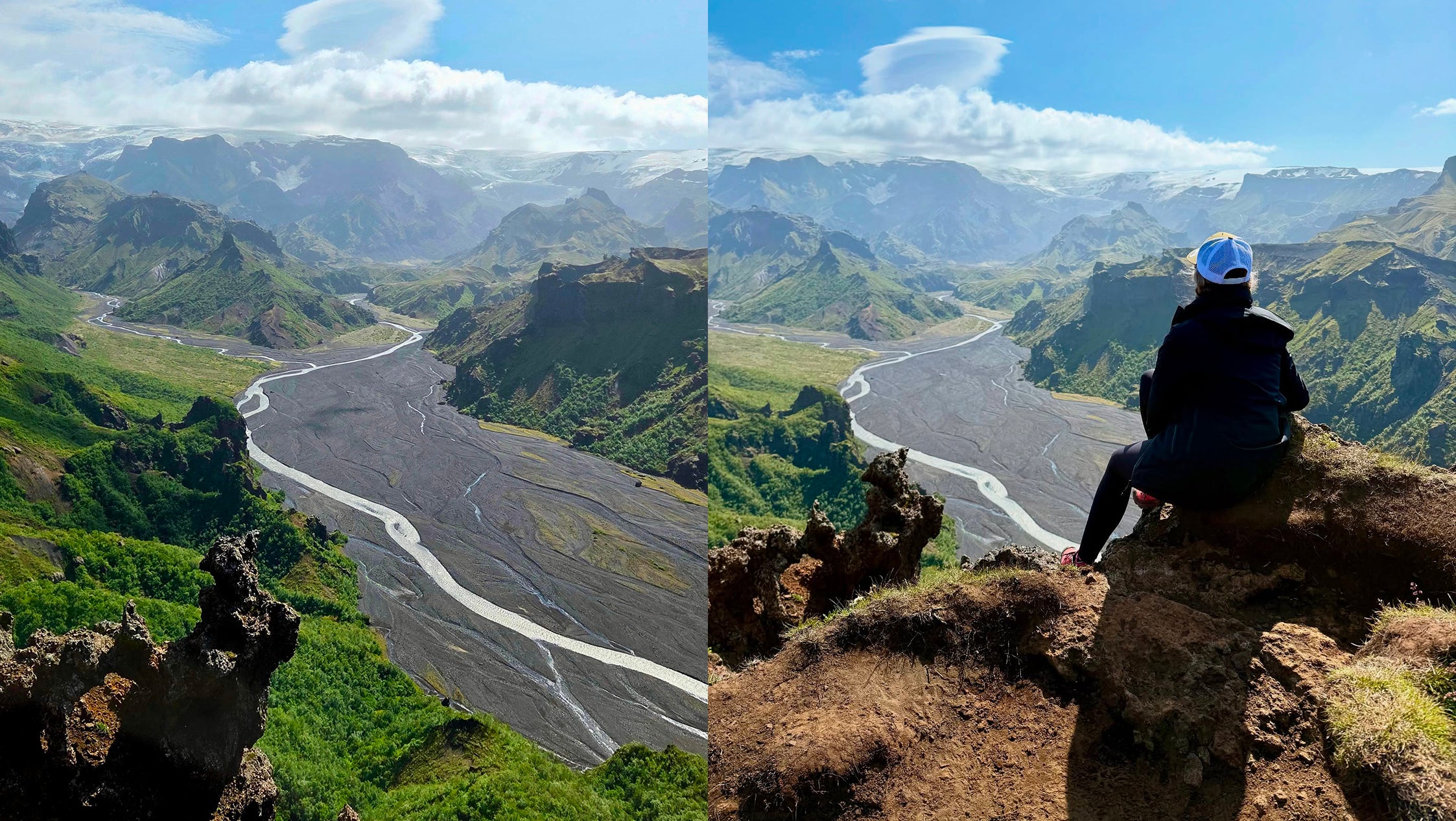 Après avoir posé les sacs au camp, on repart léger pour une rando optionnelle vers un endroit… absolument irréel : le canyon Markarfljótsgljúfur (oui, même Google abandonne sur la prononciation). Le sentier file doucement entre les collines sombres, puis d’un coup, le décor s’ouvre. Et là… Le silence. Le choc. Un canyon gigantesque, profond, taillé dans la roche noire. Des parois verticales qui semblent sculptées au couteau. Des plaques de mousse vert fluo qui explosent de couleur sur le basalte sombre. Et tout au fond, un glacier qui se dessine à l’horizon, comme si le décor avait été monté pour un film. C’est brut. C’est immense. C’est l’un des endroits les plus spectaculaires du trek; un vrai chef-d’œuvre naturel, l’Islande dans sa version la plus sauvage, la plus artistique, la plus impressionnante. Un final parfait pour une journée déjà exceptionnelle.