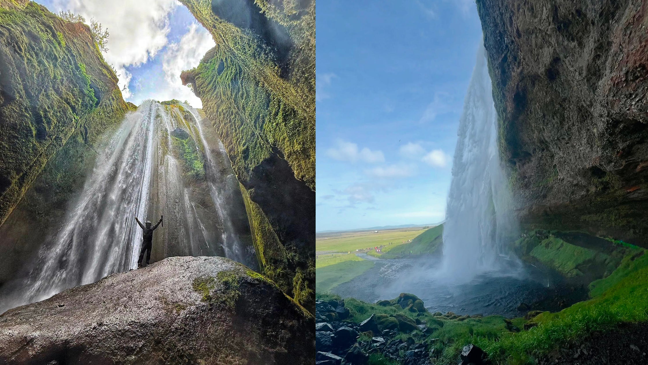 Juste à 500 mètres, bien cachée derrière une paroi rocheuse, se trouve Gljúfrabúi, la cascade secrète. Pour l’atteindre, il faut s’aventurer dans une faille étroite où une rivière coule entre les murs. Et là, d’un coup, on se retrouve dans une petite cathédrale naturelle : une chute d’eau puissante enfermée dans une chambre de roche. Ambiance mystique assurée; c’est le genre d’endroit qui te fait chuchoter sans savoir pourquoi.